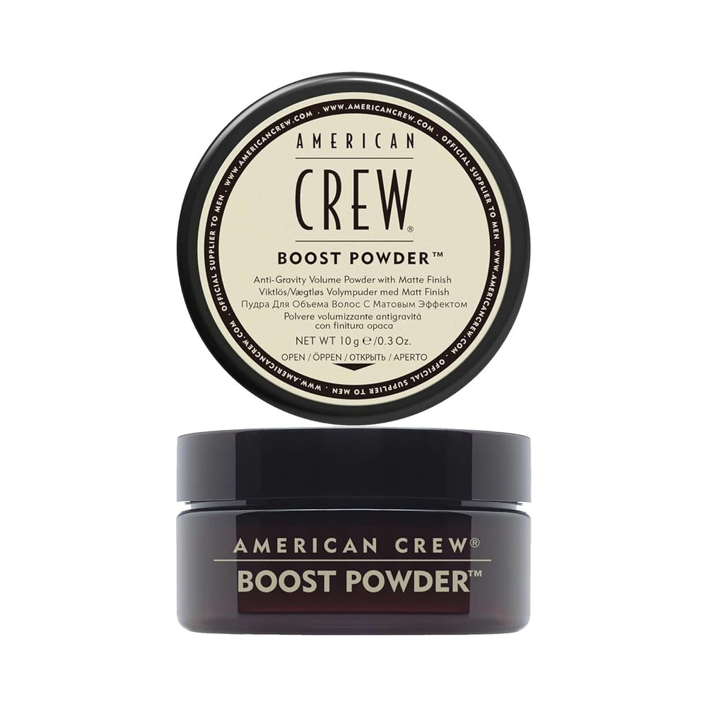Anti-gravity volume powder with matte finish Give hair lift, thickness and a matte finish with American Crew Boost Powder. This weightless powder adds grit for dramatic, gravity-defying texture. And, it can be layered with virtually any other American Crew styling product.