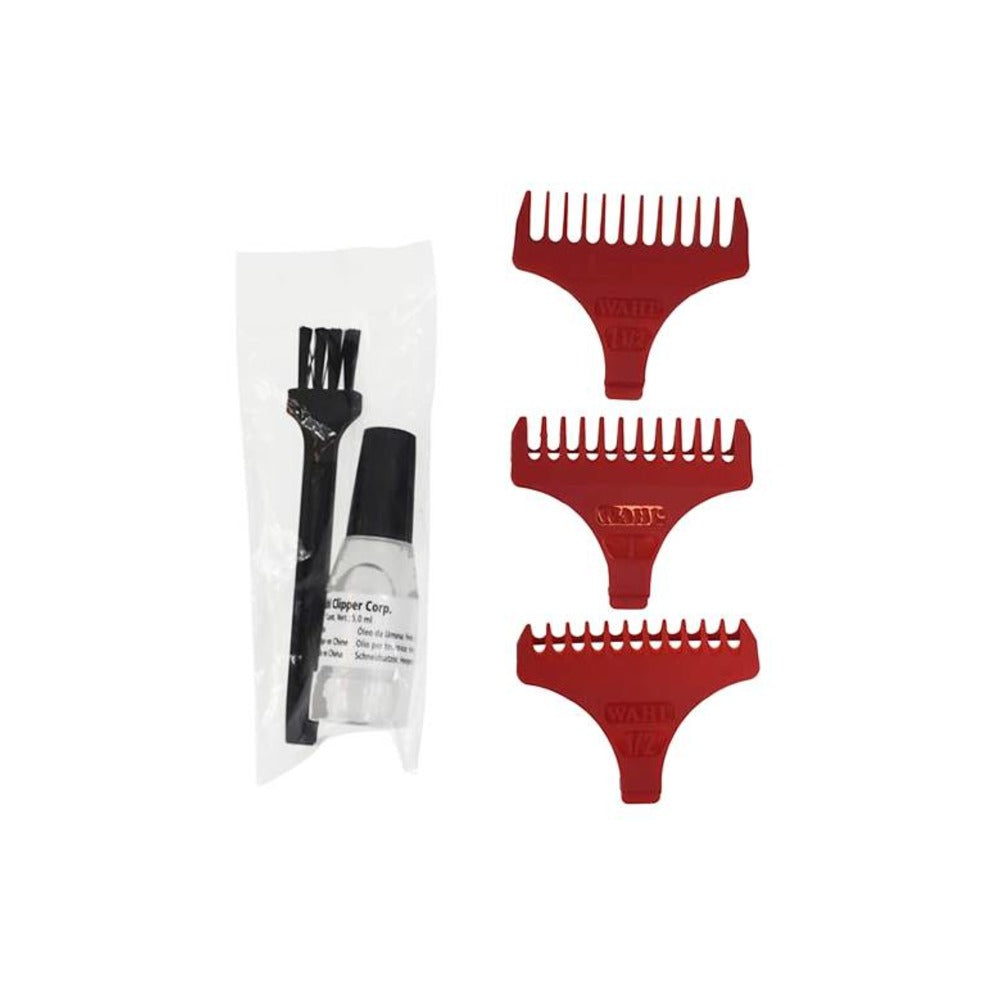 Contains all available combs for the Wahl Detailer trimmer with Extra Wide T-Blade.