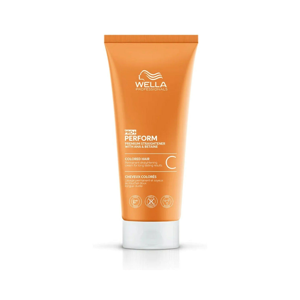 Wella Professionals Perform+ Straightening Cream for Coloured Hair 200ml is a professional salon treatment designed to transform coloured hair into sleek, straight, and manageable styles. This advanced formula smooths hair texture while preserving colour vibrancy, leaving hair soft and shiny for up to six months. Enriched with Bond Builder and Betaine, it protects and nourishes the hair during straightening, ensuring strength and elasticity throughout the process.